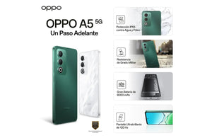 Celular Oppo A5 5G 256GB Verde, un smartphone diseñado para seguirte el ritmo. Gracias a su gran batería, tienes energía para todo lo que necesites
