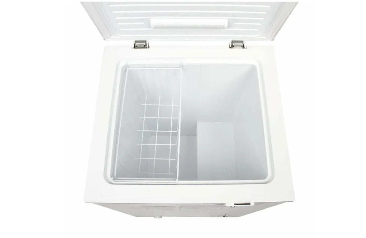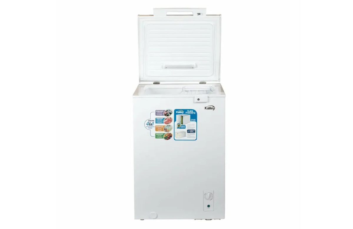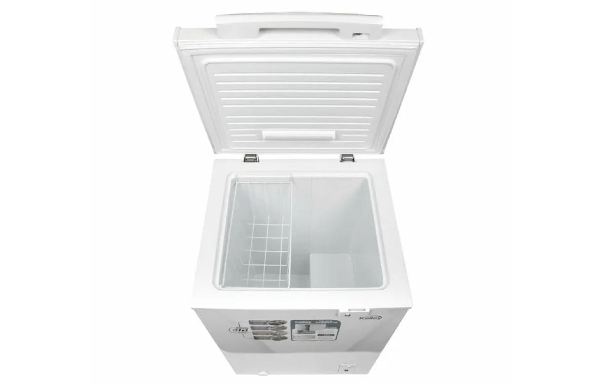 Congelador horizontal Kalley Dual de 99 litros para que almacenes tus alimentos y se mantengan frescos. Tiene una temperatura ajustable según tu necesidad y con su función 4 en 1 que refrigera, conserva, pre congela o congela. Además cuenta con ruedas para un fácil desplazamiento, sistema de seguridad con llave en la puerta y una canastilla de alambre