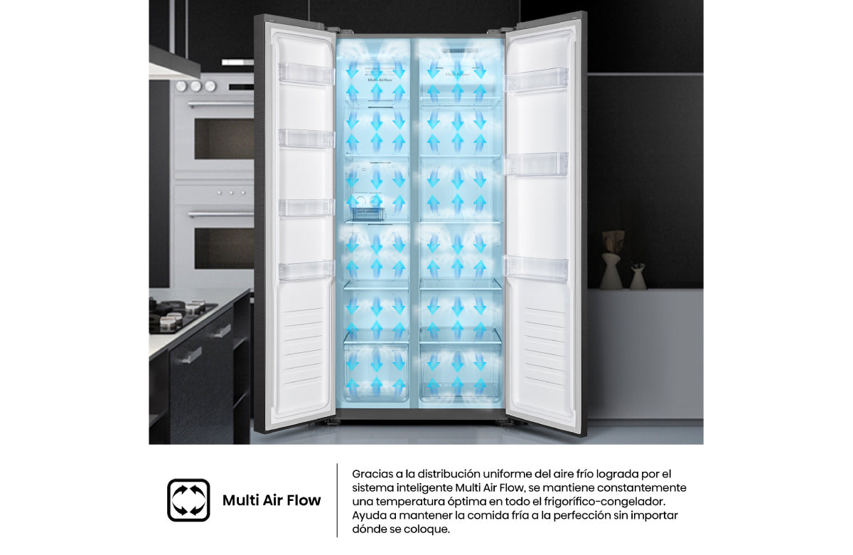 Sistema de enfriamiento envolvente: el aire frío circula de manera uniforme en cada rincón del refrigerador, manteniendo una temperatura constante. Así, cada alimento conserva su frescura y sabor, brindando confianza y tranquilidad en cada preparación