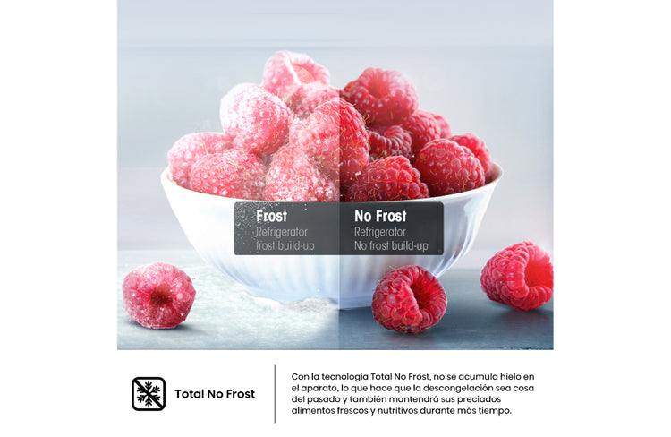 Une diseño elegante y tecnología avanzada para tu día a día. Sus puertas planas y manija metálica empotrada se integran con tu cocina, mientras Total No Frost elimina el deshielo y conserva frescura