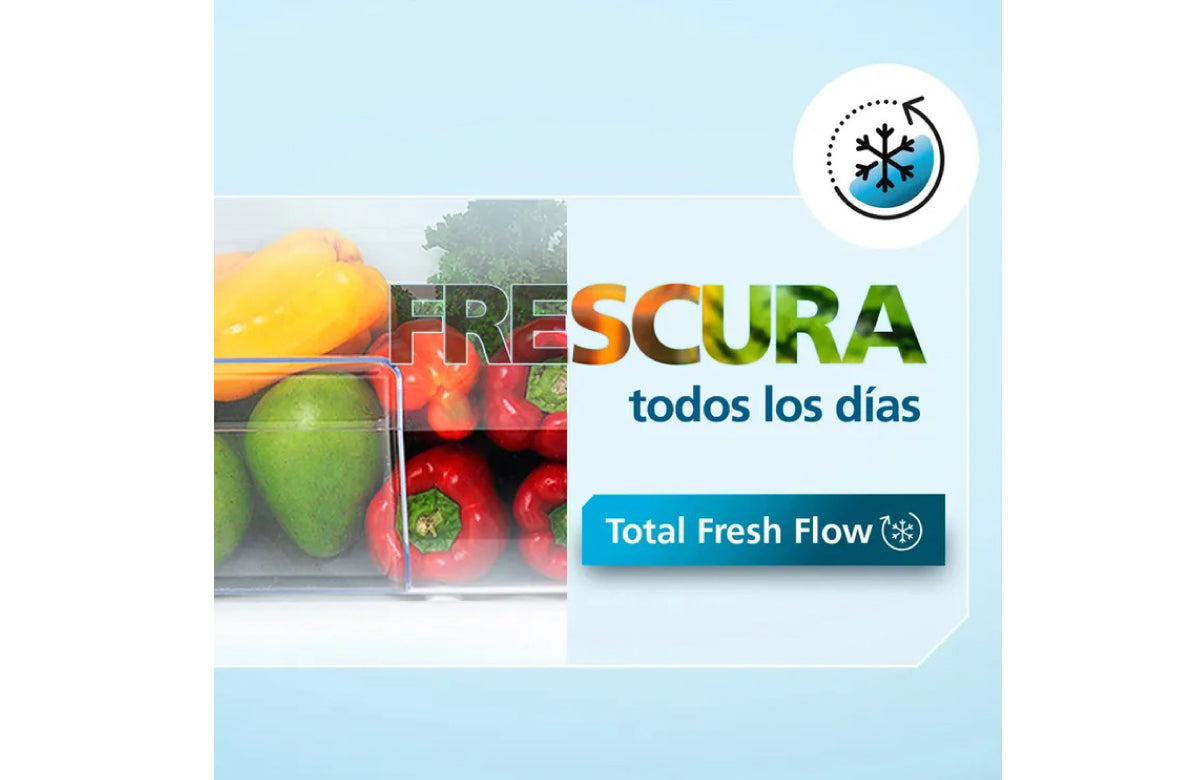 Gran capacidad interior para almacenar todo lo que necesites sin preocuparte por el espacio y tecnología Total Fresh Flow, para que tus alimentos estén siempre frescos.