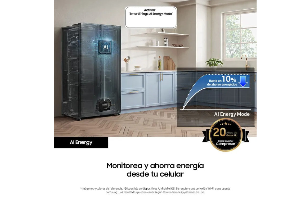 Nevecón Samsung Side by Side 583 Litros con Inteligencia Artificial y conectividad para monitorear, controlar y ahorrar energía desde tu celular