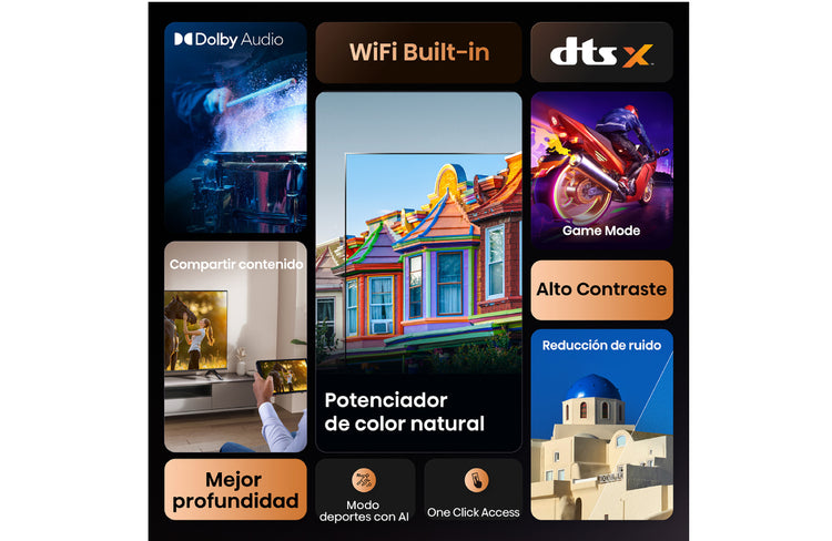 Películas, series, deportes, música... el entretenimiento que amas es aún mejor cuando lo escuchas en un televisor Hisense con DTS® Virtual:X™ y Dolby Audio. Su claridad cristalina, diálogos fáciles de escuchar, gran nivel de detalle y efectos de sonido envolvente realistas se combinan para intensificar el impacto de tus escenas y eventos favoritos