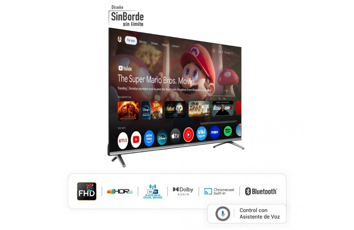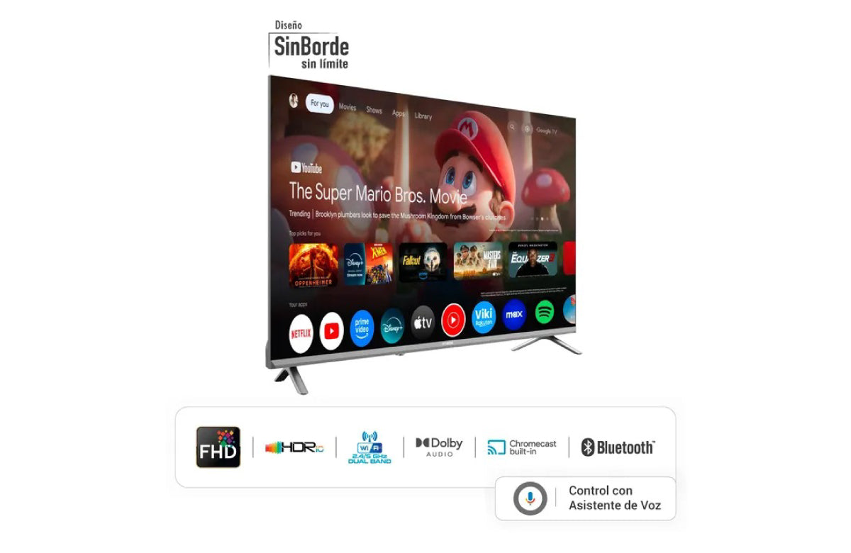 Cuenta con una increíble pantalla Full HD con compatibilidad HDR 10 para disfrutar de tu contenido favorito con muchos más colores. Vive una experiencia envolvente e inmersiva con su tecnología de Dolby Audio y activa el asistente de voz desde tu control remoto. Su sistema operativo Google TV cuenta con +10.000 apps, con una interfaz simple y con recomendados para cada perfil de usuario según sus preferencias