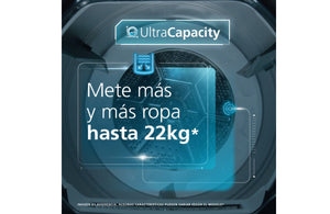 Ultracapacity reduce la frecuencia de lavado, con la capacidad de hasta 22 kg que te permite agregar mayor cantidad de prendas en una sola carga